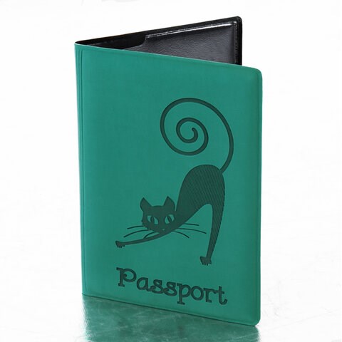 Модель выполнена из мягкого полиуретана бирюзового цвета, украшена изображением изящной кошки и тисненой надписью "Паспорт". На внутреннем развороте расположены два кармана из прозрачного пластика. Благодаря компактным размерам 97х138 мм удобно всегда носить с собой.