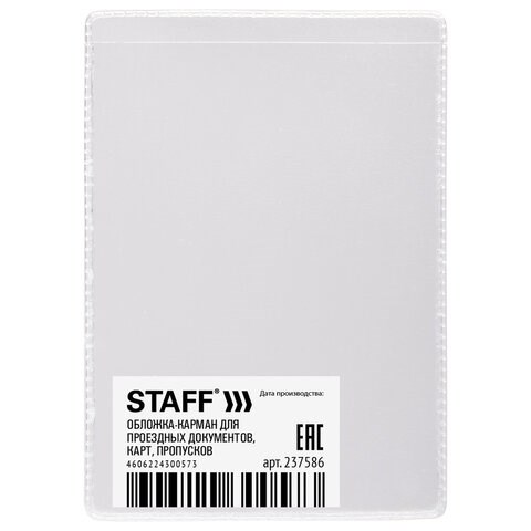 Обложка-карман для проездных документов, карт, пропусков, 100х65 мм, ПВХ, прозрачная, STAFF, 237586