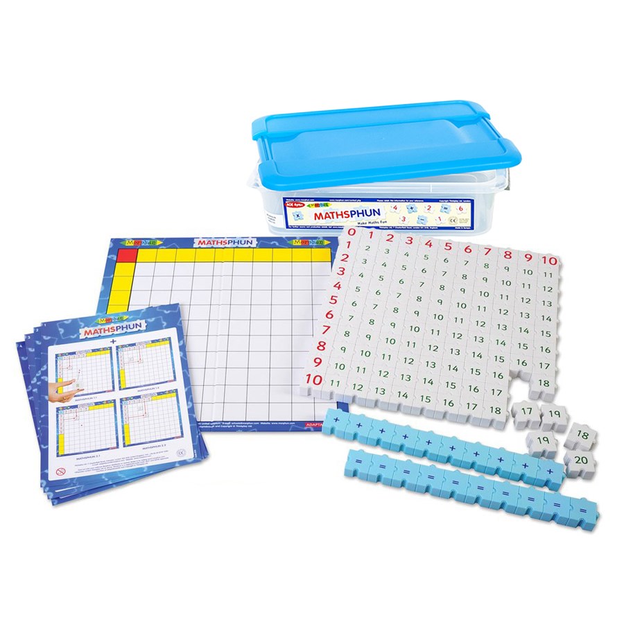 Набор состоит из 122 белых деталей, 100 деталей из них с зелеными цифрами от 1 до 20 и 22 детали с красными цифрами от 0 до 10, а также голубые детали с математическими знаками «+» и «=».