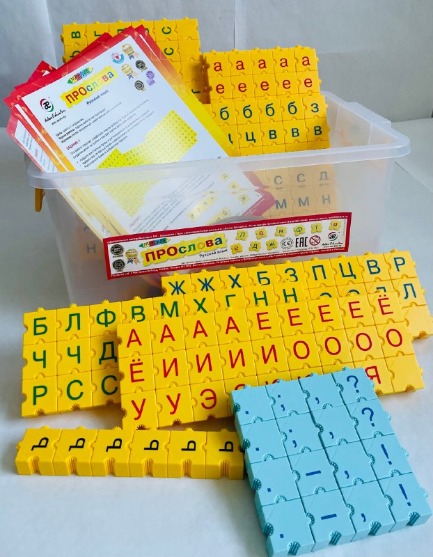 Набор состоит из деталей желтого цвета с нанесенными буквами и знаками препинания, соединяемых особых способом, исключающим неправильное расположение букв.