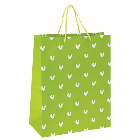 Изготовлен из ламинированной мелованной бумаги с веревочными ручками из полипропилена. Размер – 26x13x32 см. Пакет с принтом в виде галочек-сердечек выполнен в зеленом цвете.