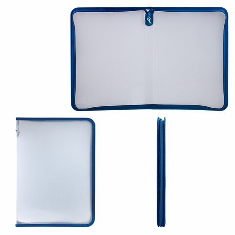 Изготовлена из прочного прозрачного матового пластика толщиной 0,5 мм с диагональной фактурой. Формат А4 (325х230 мм). Надежный замок-молния защищает документы от механических повреждений, а также пыли и влаги. Цвет молнии - синий.