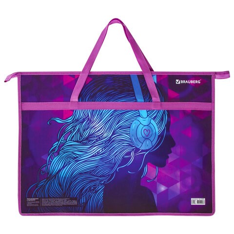 Папка BRAUBERG "Melody" предназначена для хранения чертежей, рисунков и других художественных изображений. Выполнена из пластика, по краям имеет тканевую окантовку. Одно отделение. Застежка-молния расположена по верхнему краю папки. Цветная печать.