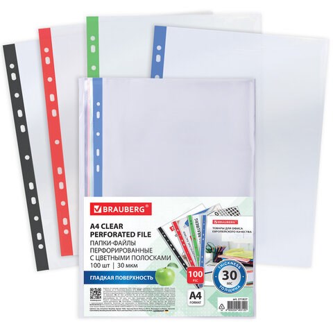 Перфорированные папки-файлы BRAUBERG с цветными полосками предназначены для хранения документов в папке с любым кольцевым механизмом или скоросшивателем.