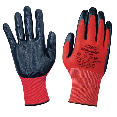 Перчатки полиэфирные ОИЛРЕЗИСТ маслобензостойкие 1 пара, 15 класс, 42-44 г, размер 9, покрытие - облив НИТРИЛОВОЕ, прочные, тактильные, СВС, nl13nt крас/чер