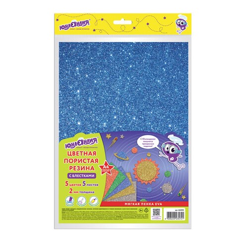Пористая резина/фоамиран А4, 2 мм, 5 листов, 5 цветов, яркие цвета, блестки, ЮНЛАНДИЯ, 662052