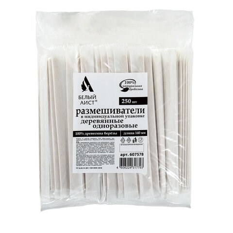 Размешиватели изготовлены из древесины березы. Безопасны при использовании, так как не выделяют вредных веществ при взаимодействии с горячей жидкостью. Подойдут как для холодных, так и для горячих блюд (до +95°). Предназначены для одноразового применения, легко утилизируются. Длина - 140 мм. В комплекте 250 штук в индивидуальной бумажной упаковке.