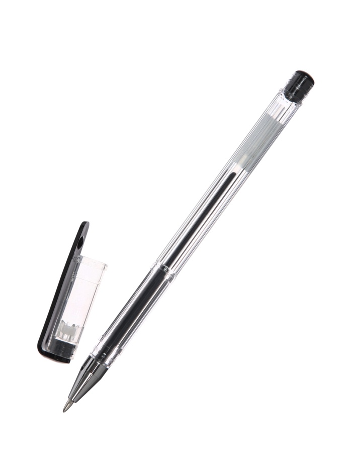 - Неавтоматическая гелевая ручка с чёрным стержнем и защитным колпачком.