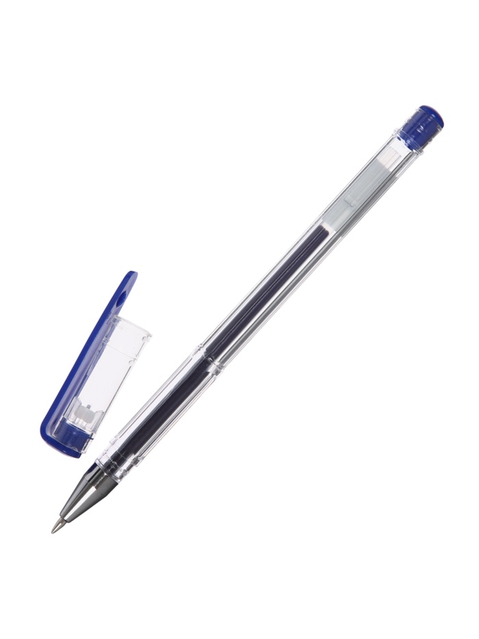 - Неавтоматическая гелевая ручка с синим стержнем и защитным колпачком.
