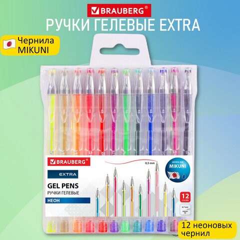 Ручки гелевые НЕОН BRAUBERG "EXTRA", НАБОР 12 ЦВЕТОВ, узел 0,7 мм, линия 0,5 мм, 143912