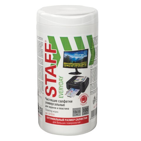 Чистящие влажные салфетки STAFF предназначены для удаления пыли и загрязнений с экранов мониторов, ноутбуков, телевизоров, а также протирки пластиковых поверхностей - клавиатур, компьютеров (ПК), телефонных аппаратов, мебели и т.д.