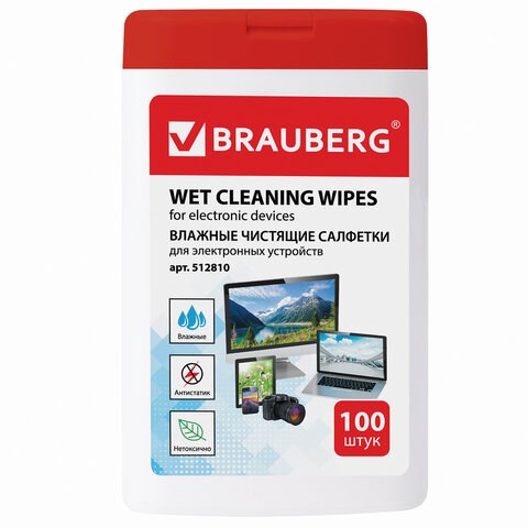 Салфетки для электронных устройств универсальные BRAUBERG, компактная туба 100 шт., влажные, 512810