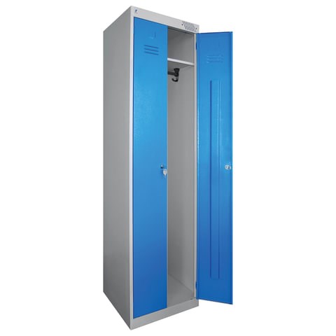 Металлический шкаф для одежды. Предназначен для использования в производственных, спортивных и других помещениях. Подходит для установки в помещениях с повышенной влажностью.