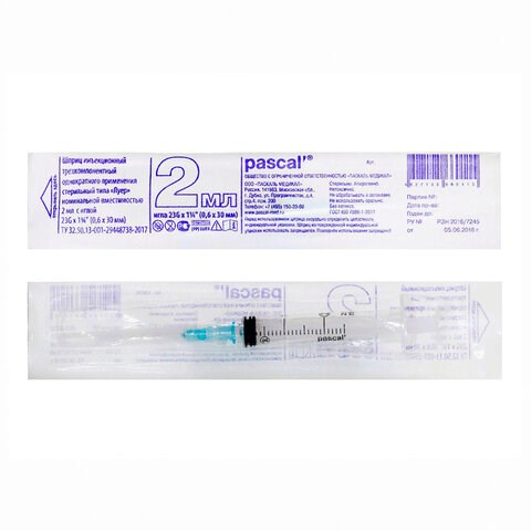 Трехкомпонентный одноразовый шприц изготовлен из специального полипропилена. Нетоксичен, апирогенен. Объем - 2 мл, размер иглы - 23G.