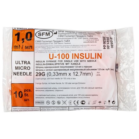 Шприц инсулиновый SFM, 1 мл, КОМПЛЕКТ 10 шт., пакет, U-100 игла несъемная 0,33х12,7 мм - 29G, 534250