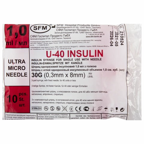 Шприц инсулиновый SFM, 1 мл, КОМПЛЕКТ 10 шт., в пакете, U-40 игла несъемная 0,3х8 мм - 30G, 534254