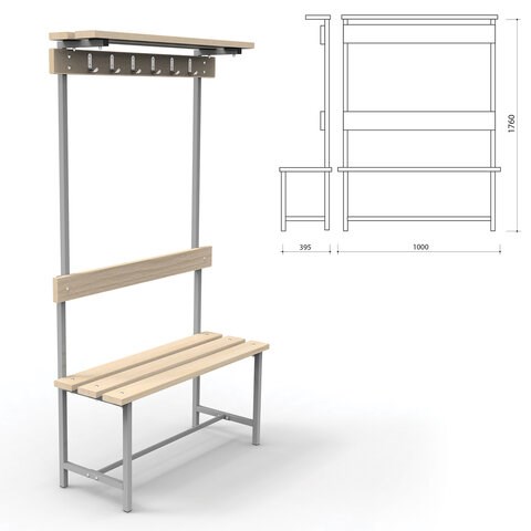 Скамья с вешалкой, спинкой и полкой "СВТ 7", 1760х1000х395 мм, 6 крючков, дерево, регулируемые опоры, каркас металлический серый, сиденье де