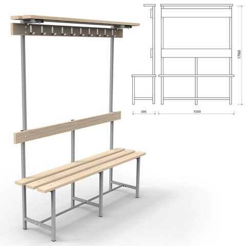 Скамья с вешалкой, спинкой и полкой "СВТ 8", 1760х1500х395 мм, 10 крючков, регулируемые опоры, каркас металлический серый, сиденье дерево