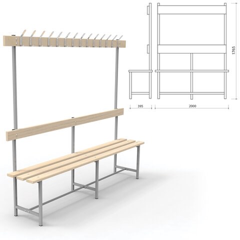 Скамья с вешалкой, спинкой "СВТ 6", 1765х2000х395 мм, 14 крючков, регулируемые опоры, каркас металлический серый, сиденье дерево