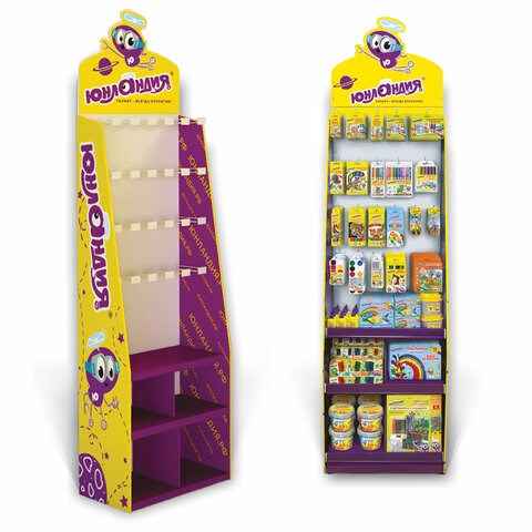 Выполнена из нескольких слоев плотного картона. Повышенная прочность позволяет расположить максимальное количество самых популярных товаров ЮНЛАНДИЯ: от легких карандашей до бумажно-беловой продукции и пластилина.