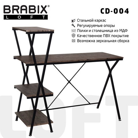 Функциональность стола обеспечивается тремя дополнительными полками, где можно хранить необходимые для вашей работы вещи: от канцелярских принадлежностей и книг до ноутбука. Оптимальные габариты BRABIX "LOFT CD-004" подходят даже для небольших помещений.