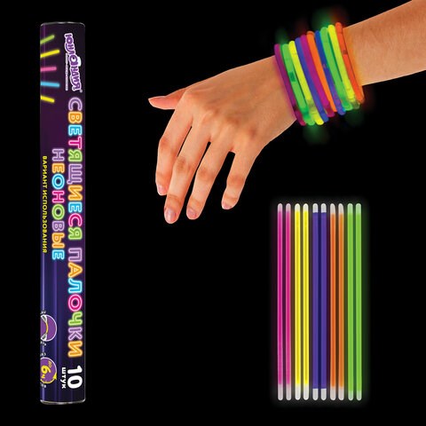 Дают неоновое свечение пяти разных цветов. Палочки водонепроницаемые и могут быть использованы в дождливую погоду и даже под водой на небольшой глубине. Светятся до 6 часов. Для активации палочку следует надломить в нескольких местах и тщательно потрясти, чтобы сделать свечение более равномерным. Вставив оба конца палочки в коннектор, можно сделать яркий браслет.