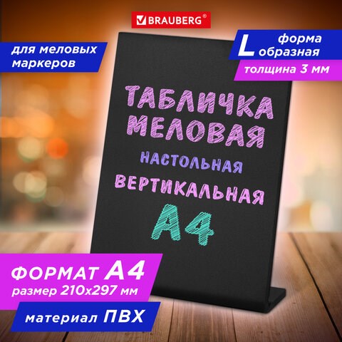 Табличка меловая настольная А4 (21x29,7 см), L-образная, вертикальная, ПВХ, ЧЕРНАЯ, BRAUBERG, 291292
