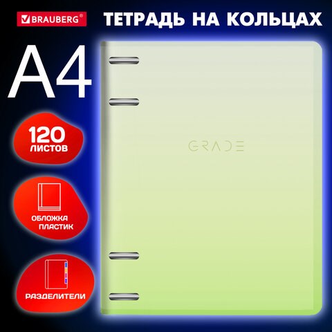 Тетрадь на кольцах БОЛЬШАЯ 305х235 мм А4, 120 л., пластик, с разделителями, BRAUBERG, Зеленый, 404625