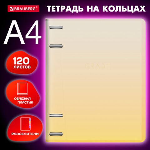 Тетрадь на кольцах БОЛЬШАЯ 305х235 мм А4, 120 л., пластик, с разделителями, BRAUBERG, Желтый, 404624