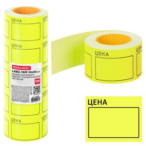 Ценник большой "Цена" 50х40 мм желтый, самоклеящийся, КОМПЛЕКТ 5 рулонов по 200 шт., BRAUBERG, 112358