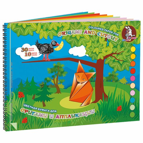 Цветная бумага А4 для аппликаций и оригами, 30 л., 10 цв., 80 г/м2, гребень, "Басня", 210х297 мм, ПО-9166
