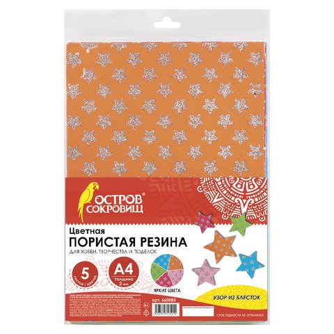 Цветная пористая резина (фоамиран), А4, толщина 2 мм, ОСТРОВ СОКРОВИЩ, 5 листов, 5 цветов, блестящие звезды, 660085