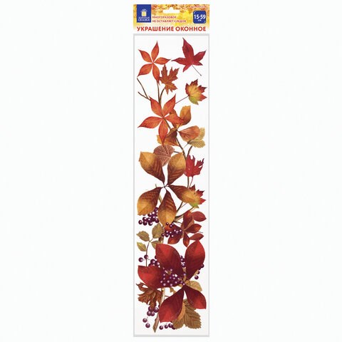 Изделие с осенним тематическим изображением представляет собой наклейку на окно/стекло, изготовленную из поливинилхлорида (ПВХ). Наклейка размером 14,8х59 см декорирована разноцветным глиттером. Украшение предназначено для декорирования окон, зеркал, стекол и других ламинированных глянцевых поверхностей. Не оставляет клеевых следов и предназначено для многократного использования. Крепится к поверхности посредством статического эффекта. Украшение на белой картонной подложке упаковано в прозрачный полипропиленовый пакет на картонном подвесе.