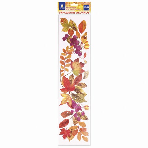 Изделие с осенним тематическим изображением представляет собой наклейку на окно/стекло, изготовленную из поливинилхлорида (ПВХ). Наклейка размером 14,8х59 см декорирована разноцветным глиттером. Украшение предназначено для декорирования окон, зеркал, стекол и других ламинированных глянцевых поверхностей. Не оставляет клеевых следов и предназначено для многократного использования. Крепится к поверхности посредством статического эффекта. Украшение на белой картонной подложке упаковано в прозрачный полипропиленовый пакет на картонном подвесе.