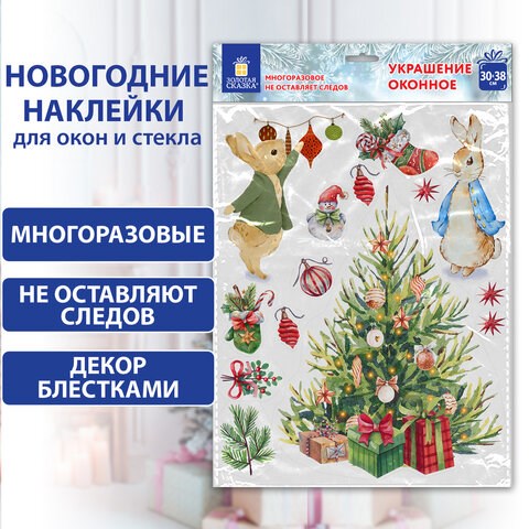 Наклейка для окон двусторонняя МНОГОРАЗОВАЯ 30х38 см "Зайцы и ёлка", ЗОЛОТАЯ СКАЗКА, 591181