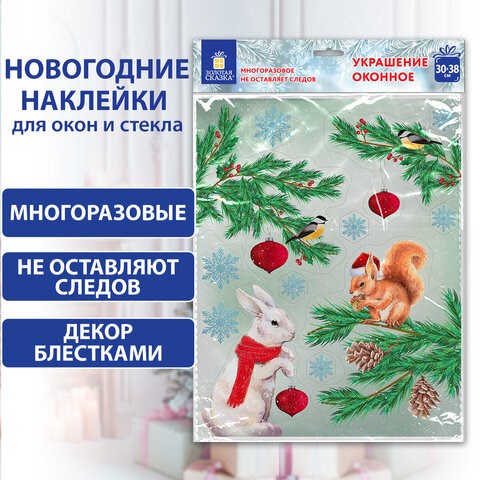 Наклейка для окон двусторонняя МНОГОРАЗОВАЯ 30х38 см "Зверята и ёлка", ЗОЛОТАЯ СКАЗКА, 591186