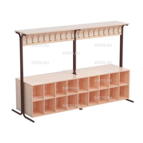Вешалка напольная (со стеллажом) на 36 мест изготавливается на металлическом каркасе из трубы круглого сечения, в верхней части соединяется панелями из ламинированной ДСП 16 мм, а в нижней — стеллажом из ламинированной ДСП 16мм. Кромки щитовых элементов облицованы кромкой ПВХ в тон ЛДСП.