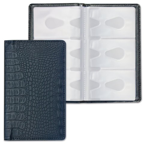 Обложка из материала под кожу крокодила, прошита по периметру. Подходит для горячего тиснения. Содержит 48 карманов из мягкого ПВХ с антибликовой фактурой на 96 визитных карточек или 96 и дисконтных карт. Размер изделия - 115х200 мм.