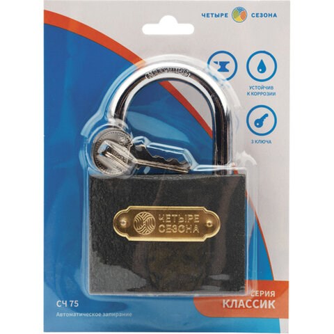 Замок навесной, ширина 75 мм, чугун, дужка d-9,5 мм, английский, 3 ключа, в блистере, 79-0007